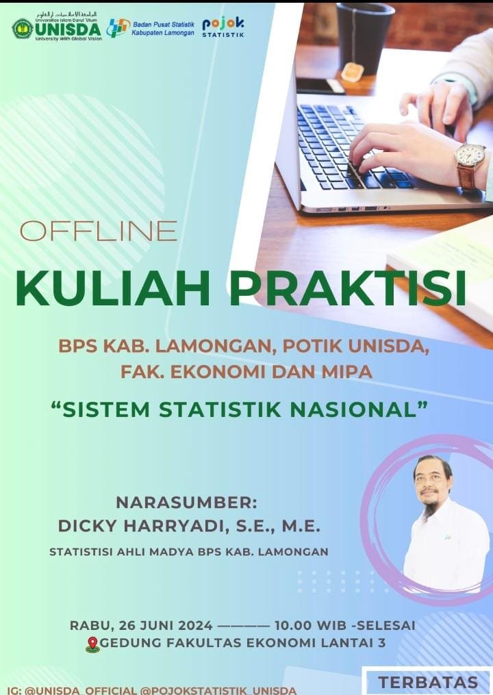Lamongan – Pada Rabu, 26 Juni 2024, Fakultas Ekonomi dan MIPA Universitas Islam Darul Ulum Lamongan (UNISDA) bekerja sama dengan Badan Pusat Statistik (BPS) Kabupaten Lamongan mengadakan Kuliah Praktisi bertajuk *”Sistem Statistik Nasional”*. Acara ini berlangsung di Gedung Fakultas Ekonomi lantai 3, dengan menghadirkan narasumber Dicky Harryadi, S.E., M.E., seorang Statistik Ahli Madya dari BPS Kabupaten Lamongan. Kegiatan yang dihadiri oleh mahasiswa dari Fakultas Ekonomi dan MIPA ini bertujuan untuk memberikan pemahaman mendalam mengenai peran dan fungsi sistem statistik nasional dalam mendukung pengambilan kebijakan di berbagai sektor.