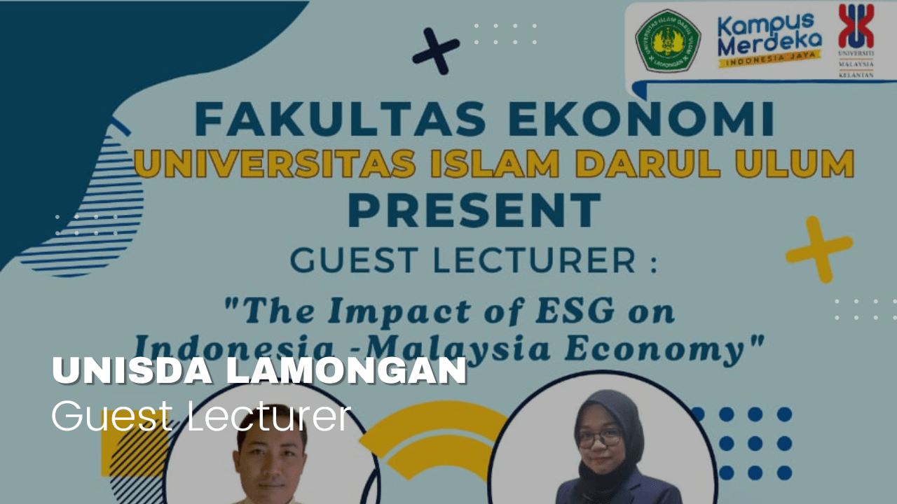 Lamongan – Fakultas Ekonomi Universitas Islam Darul Ulum Lamongan (UNISDA) sukses menggelar acara Guest Lecturer bertajuk “The Impact of ESG on Indonesia – Malaysia Economy” pada Rabu, 17 Januari 2024. Acara yang diselenggarakan secara virtual melalui Zoom ini dihadiri oleh para mahasiswa dan dosen, serta menghadirkan pembicara dari Indonesia dan Malaysia yang membahas dampak penting ESG (Environmental, Social, and Governance) terhadap perekonomian kedua negara. Acara dimulai pukul 13.00 WIB dengan sambutan dari Dr. Novi Darmayanti, S.E., M.SA., Ak., CA, Dekan Fakultas Ekonomi UNISDA, yang memberikan welcome speech. Dalam sambutannya, Dr. Novi menyampaikan betapa pentingnya topik ESG dalam konteks ekonomi global saat ini. Beliau berharap bahwa acara ini dapat memberikan wawasan mendalam bagi mahasiswa dan dosen mengenai peran ESG dalam menciptakan ekonomi yang berkelanjutan di Indonesia dan Malaysia.