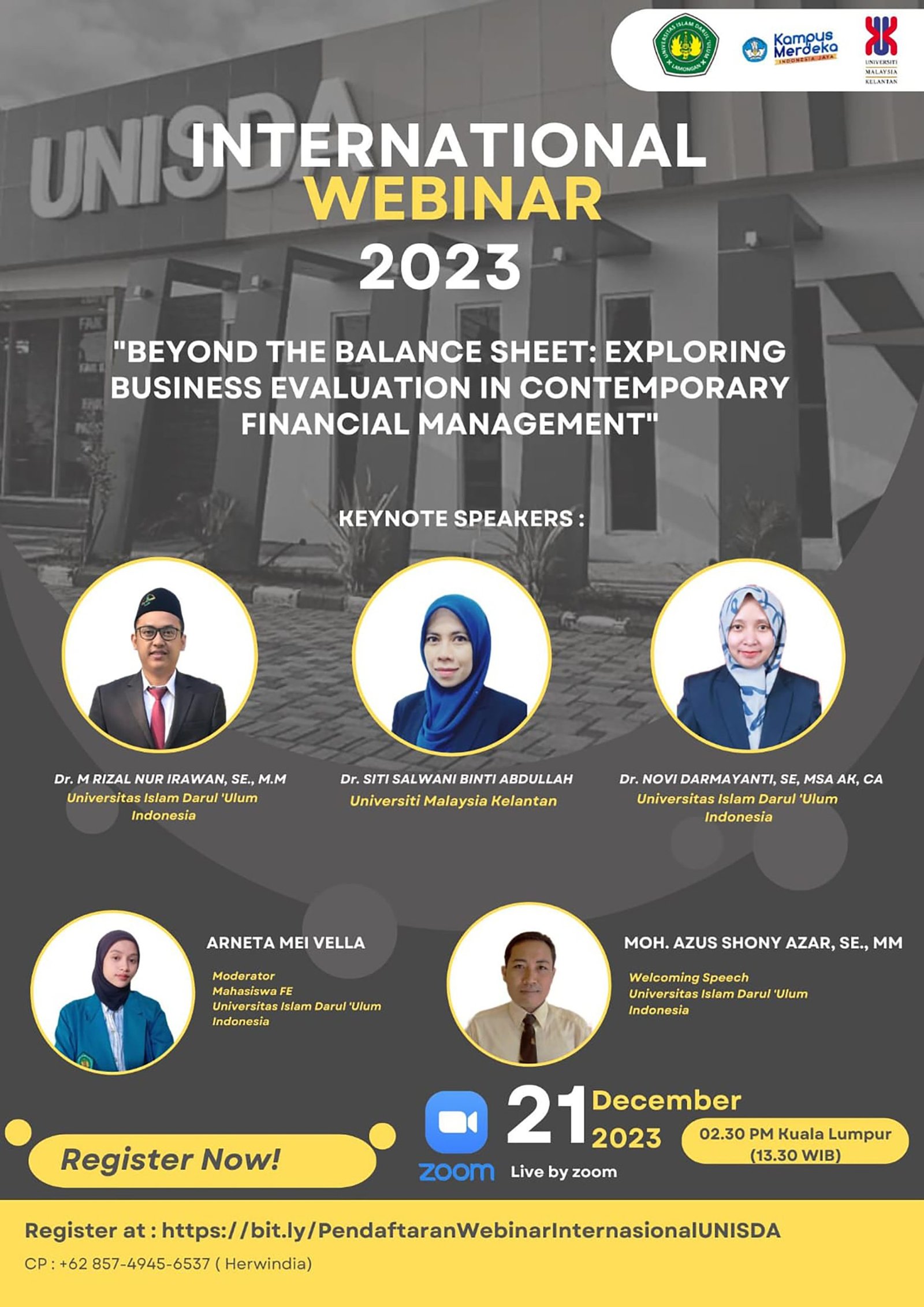 Lamongan – Universitas Islam Darul ‘Ulum (UNISDA) sukses menyelenggarakan International Webinar 2023 dengan tema “Beyond the Balance Sheet: Exploring Business Evaluation in Contemporary Financial Management” pada Kamis, 21 Desember 2023. Acara yang digelar secara daring melalui platform Zoom ini berlangsung pada pukul 14.30 waktu Kuala Lumpur.