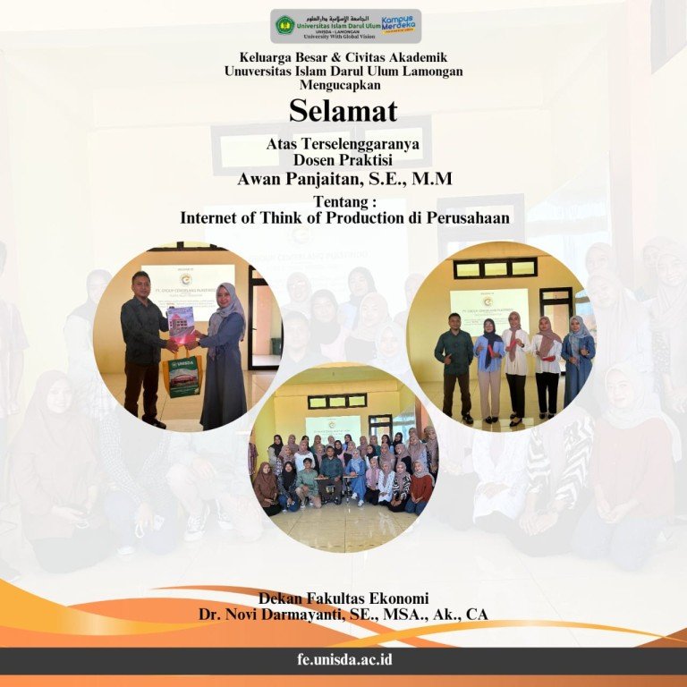 Lamongan – Fakultas Ekonomi Universitas Islam Darul Ulum Lamongan (UNISDA) sukses menggelar Kuliah Praktisi dengan tema *”Internet of Things pada Produk di Perusahaan”* pada Selasa, 16 July 2024. Acara ini menghadirkan PT Plastindo sebagai mitra industri dan Dosen Tamu, Awan Panjaitan, S.E., M.M., yang merupakan praktisi berpengalaman di bidang manajemen bisnis. Kegiatan ini bertujuan untuk memperluas wawasan mahasiswa mengenai penerapan teknologi *Internet of Things* (IoT) dalam pengelolaan produk dan operasional di dunia industri. Perwakilan Fakultas Ekonomi dalam sambutannya menyampaikan bahwa tema ini sangat relevan dengan perkembangan industri saat ini, terutama di era digital. “Kuliah Praktisi ini memberikan kesempatan bagi mahasiswa untuk memahami bagaimana teknologi IoT dapat diterapkan dalam pengelolaan produk di perusahaan, sekaligus memperkuat sinergi antara teori akademik dan praktik industri,” ungkapnya. Awan Panjaitan, S.E., M.M., sebagai dosen tamu, memberikan pemaparan mendalam mengenai penerapan IoT dalam manajemen produk di perusahaan. Beliau menjelaskan bagaimana IoT dapat meningkatkan efisiensi operasional, memperbaiki kualitas produk, dan mengoptimalkan rantai pasokan.
