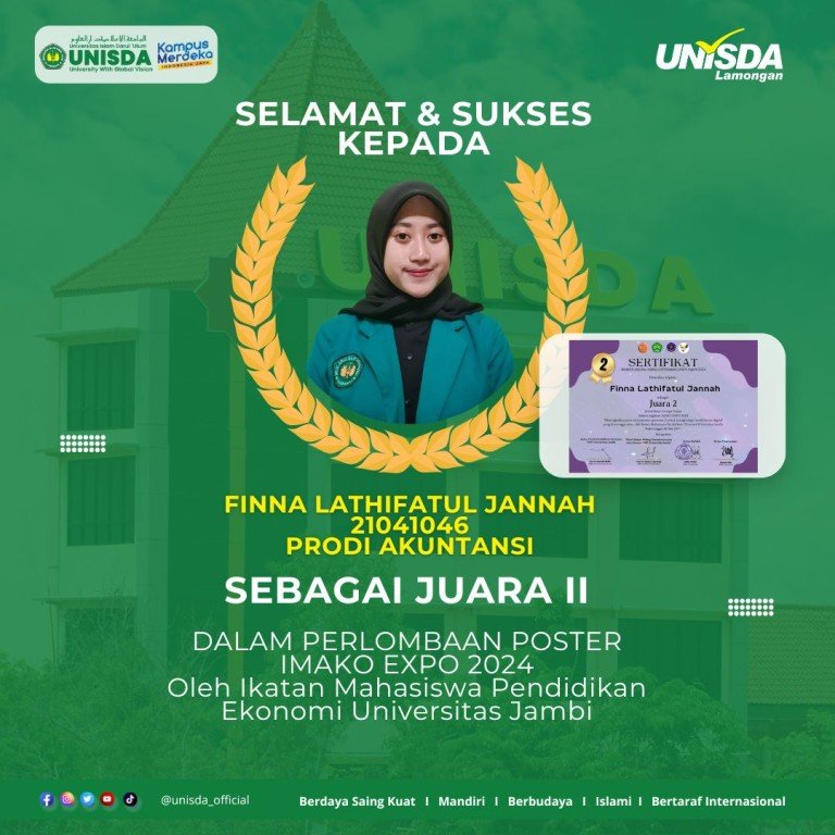 Lamongan – Mahasiswa Universitas Islam Darul Ulum Lamongan (UNISDA) kembali mencatatkan prestasi gemilang di kancah nasional. Finna Lathifatul Jannah, mahasiswa Prodi Akuntansi, berhasil meraih Juara II dalam Tangkai Lomba Dangdut Putri pada *Perlombaan Poster IMAKO EXPO 2024* yang diselenggarakan oleh Ikatan Mahasiswa Pendidikan Ekonomi Universitas Jambi. IMAKO EXPO merupakan ajang kompetisi antar mahasiswa di berbagai bidang seni dan ilmu pengetahuan. Pada tahun ini, kompetisi tersebut diikuti oleh banyak peserta dari berbagai perguruan tinggi di Indonesia.